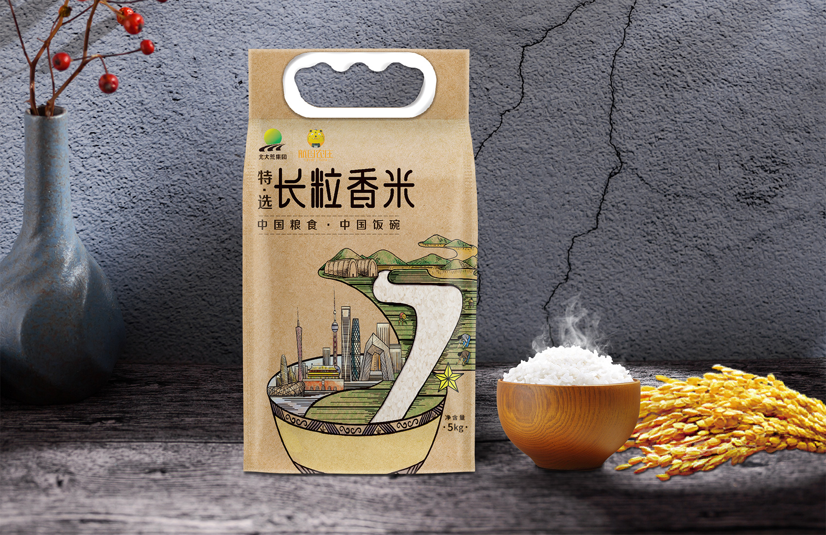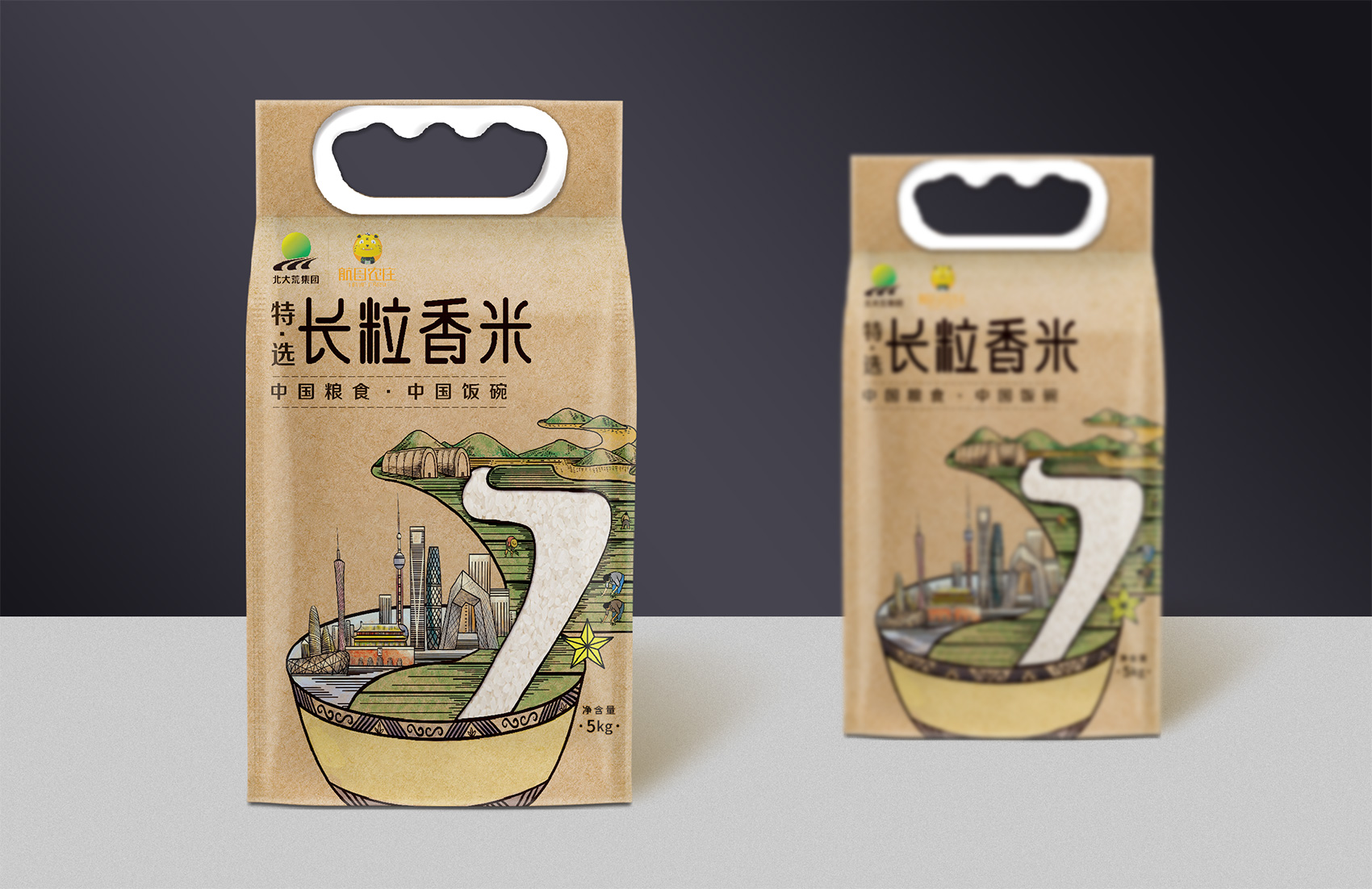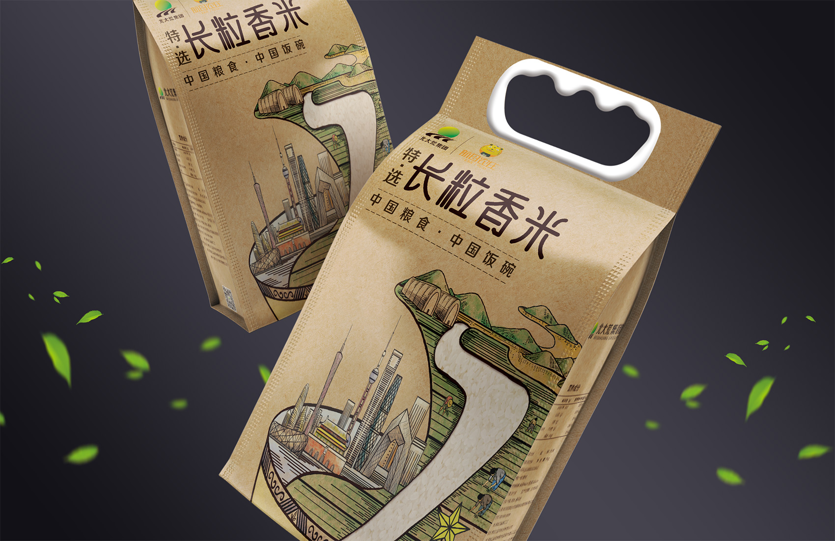 長粒香種植區(qū)位于七星農(nóng)場,在習近平總書記考察后發(fā)表了著名的中國飯碗中國糧的講話,“北大荒為中國人真正解決溫飽問題發(fā)揮了大作用,我們一定要保護好黑土地,保護好中國飯碗。中國人要把飯碗端在自己手里,而且要裝自己的糧食?!崩_策采用類版畫風格的插畫來表現(xiàn)從農(nóng)場直接到飯碗中的品牌核心價值,優(yōu)質(zhì)的綠水青山自然環(huán)境之下生產(chǎn)出高品質(zhì)好滋味的長粒香,中間的鏤空部分既象征著產(chǎn)品的產(chǎn)地——七星農(nóng)場,也象征著運送產(chǎn)品的廣闊道路,形成令人記憶深刻的超級符號;在碗中的地標性建筑物代表全國各地,寓意企業(yè)寬廣美好的未來;整體包材采用環(huán)保牛皮紙,在提升了質(zhì)感與手感的同時,也能在同質(zhì)化的包裝中脫穎而出。