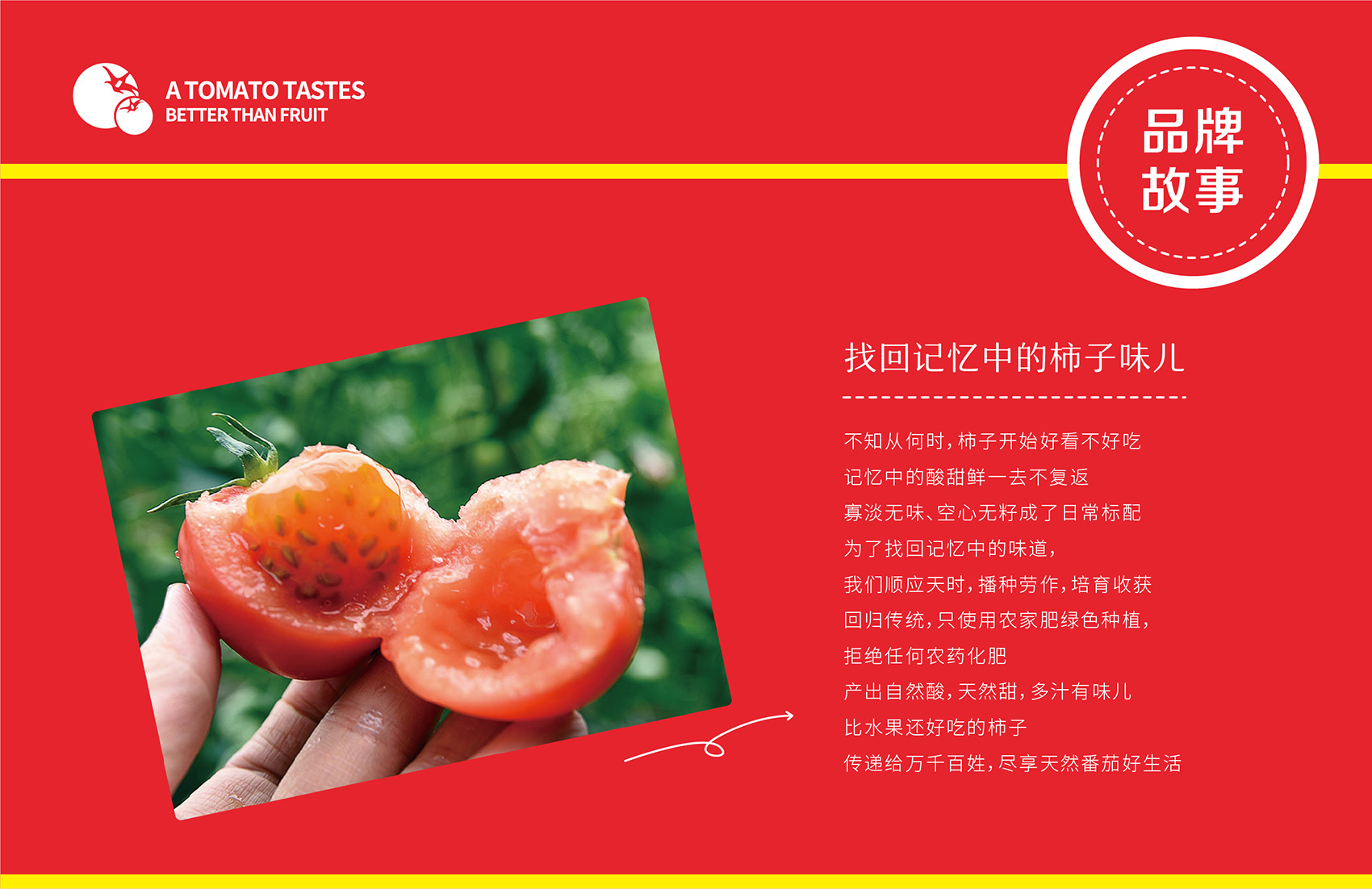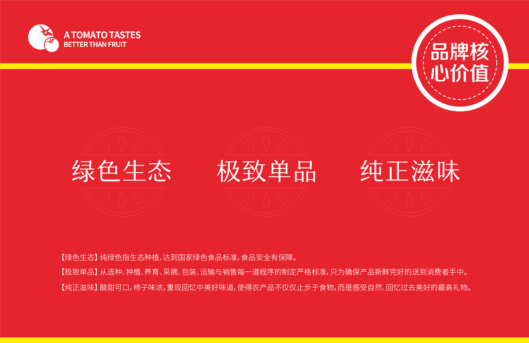 針對(duì)番佬大綠色生態(tài)番茄的定位,繽策提煉出純正為核心概念的文化體系,從品牌DNA開(kāi)始不斷貫穿番佬大番茄的美好滋味,針對(duì)目標(biāo)消費(fèi)人群的審美偏好,以質(zhì)樸平實(shí)的語(yǔ)言風(fēng)格構(gòu)建出綠色生態(tài)番茄的立體體系,slogan為“比水果還好吃的番茄”,不僅針對(duì)消費(fèi)者做出品質(zhì)的承諾與保證,讓消費(fèi)者能清楚明了的了解番佬大值得信賴(lài)的原因,更是對(duì)企業(yè)內(nèi)部的要求,指明了企業(yè)未來(lái)的發(fā)展方向,持續(xù)不斷的為百姓提供綠色健康,安全美味的品質(zhì)番茄。