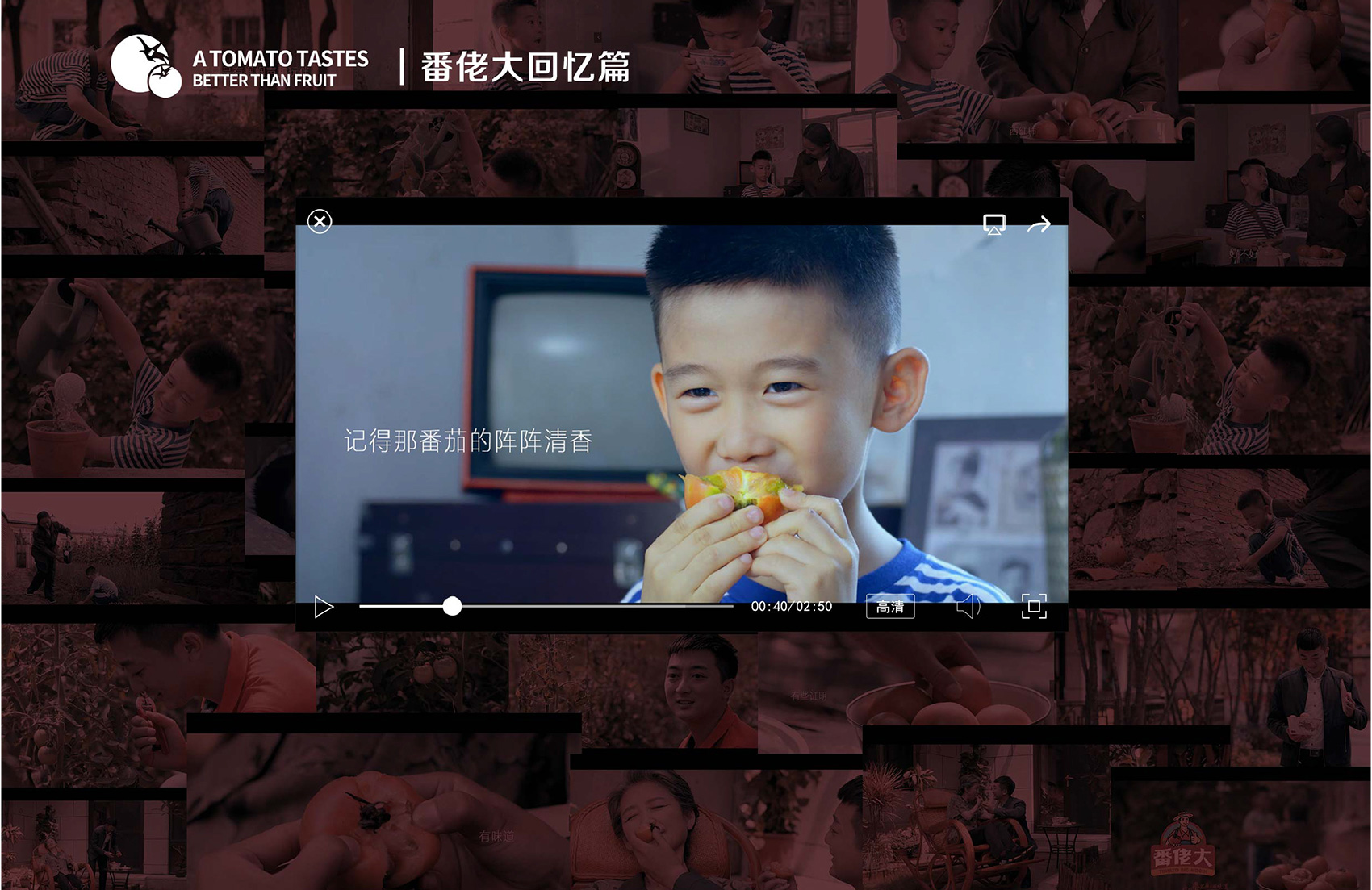 在以品牌理念與故事主導(dǎo)的回憶篇中,繽策構(gòu)思了一個(gè)有關(guān)過(guò)去回憶的小故事,一個(gè)饞嘴的小男孩,在夏日午后大汗淋漓的跑回家,媽媽親手掰開(kāi)的酸甜番茄,母子倆一起種下的種子……長(zhǎng)大后的得償所愿,繽策想表達(dá)的是曾經(jīng)的味道承載不僅僅是被埋沒(méi)在時(shí)光塵土中的老舊照片,而是那一段段難忘記憶的見(jiàn)證,找回美好的味道就是找回那些不變的美好,食物最動(dòng)人之處便是每每嘗到那種滋味,便重溫那些與最?lèi)?ài)的人之間的點(diǎn)點(diǎn)滴滴,用真情實(shí)感的構(gòu)建的故事最能打動(dòng)人心,而這與番佬大一直用高品質(zhì)生態(tài)番茄打動(dòng)所有味蕾的初心與信念不謀而合。對(duì)于場(chǎng)景中的過(guò)去場(chǎng)景的道具,繽策特別尋找了具有年代感的綠軍裝,鐵皮暖瓶,搪瓷盆,老式掛鐘等等,時(shí)代感撲面而來(lái),帶領(lǐng)觀眾穿越到了從前。沒(méi)有華麗的臺(tái)詞,沒(méi)有炫酷的特效,也沒(méi)有花哨的鏡頭,只有樸實(shí)真摯的情感流淌在其中,正如番茄酸中帶甜的味道,總能勾起平凡卻不尋常溫馨記憶。