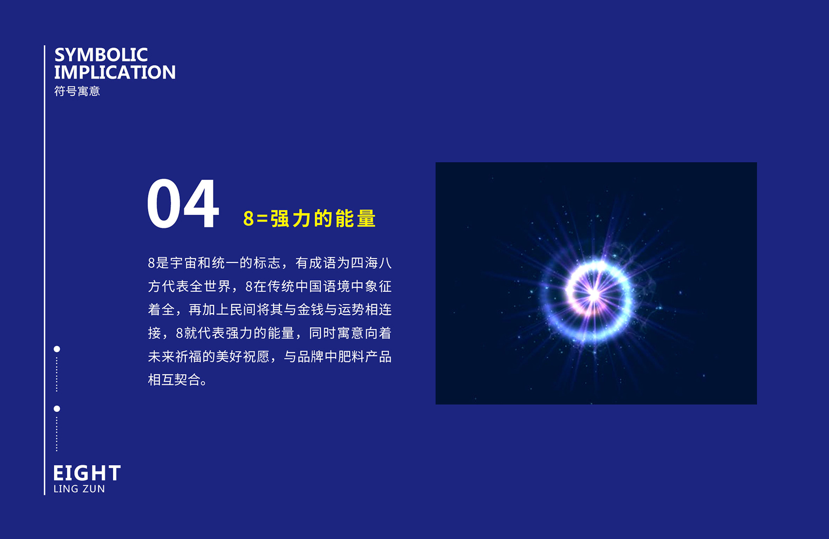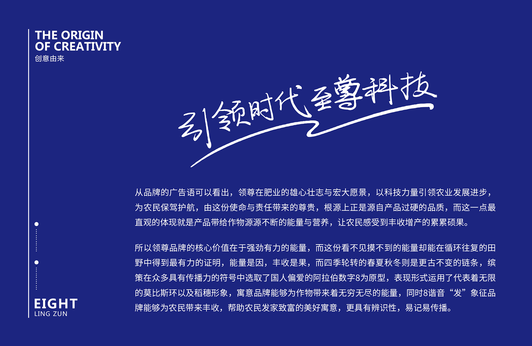 豐收一直是農民奮斗的目標,而肥料正是豐產增收的重要組成部分,從領尊的品牌廣告——引領時代,至尊科技可以看出,品牌在肥業(yè)的雄心壯志與宏大遠景,以科技力量引領農業(yè)發(fā)展進步,為農民保駕護航,這份使命與責任帶來的尊貴源自企業(yè)過硬的產品品質,所以消費者最希望看到的品牌核心價值就是肥料能夠擁有強勁能力,保證豐收增產,碩果累累。從這一角度入手,繽策思考能將看不見摸不到的能量用消費者熟悉的符號表現(xiàn)出來,能量是因,豐收是果,而新的果實又將變?yōu)榉N子再次播撒到田野中,四季輪轉中開始循環(huán),所以阿拉伯數(shù)字8成為了代表領尊的超級符號。