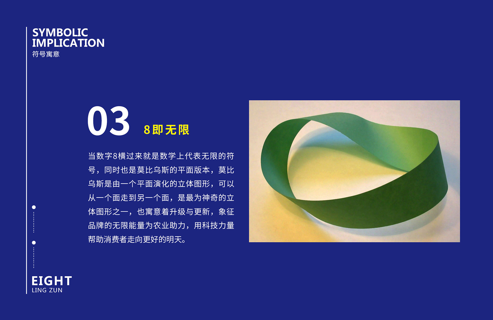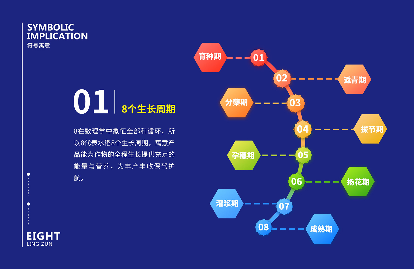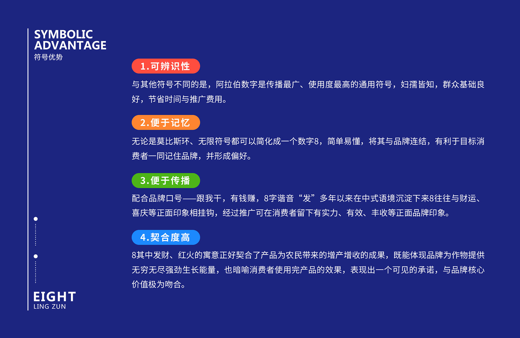 首先這一符號認知度廣泛,老幼皆知,而且能夠凝聚成一個短笑精悍的詞語,在傳播中可以有效減少損耗,便于記憶與推廣;此外將這個8放倒,就變成了代表無限的符號,予以品牌能夠為作為帶來無窮無盡的能量,而在國人心中8與“發(fā)”諧音,代表發(fā)達興旺,向消費者傳遞品牌能夠帶來豐收與財富,幫助農民發(fā)家致富,也是品牌助農致富不變的承諾,直指品牌核心價值。8在數(shù)理中也代表全部與循環(huán),寓意水稻的8個生長周期,表達了產品能夠為作物的全程勝仗提供充足的能量與營養(yǎng),為豐產豐收保駕護航。