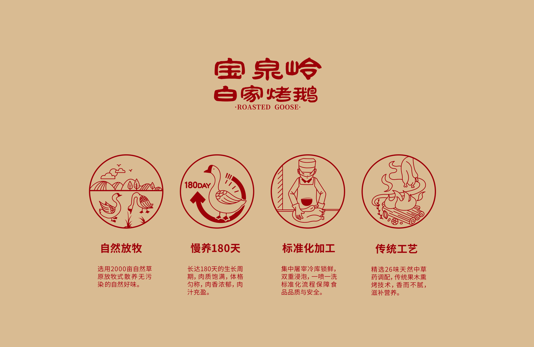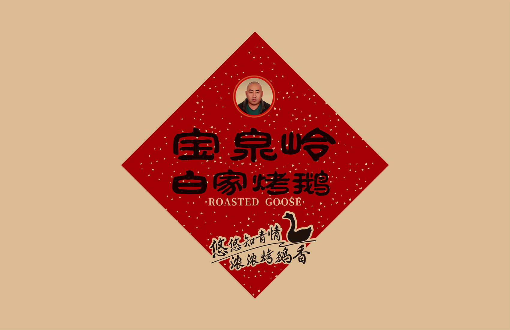 以真實形象示人代表敢為產(chǎn)品與品牌負責,白家烤鵝的LOGO選擇以創(chuàng)始人的照片進行注冊本身就代表了一種承諾,結(jié)合知青群體的審美,繽策將“寶泉嶺白家烤鵝”與標志組合成一個喜慶的中式春聯(lián)的吉祥圖案,通過中式春聯(lián)的傳統(tǒng)符號將寶泉嶺白家烤鵝植入到消費者心智,形成喜慶紅火,佳節(jié)伴手禮的品牌印象;字體使用原創(chuàng)設(shè)計字體,參考傳統(tǒng)隸書的書法風(fēng)格,方勁古拙,厚重可靠,其中的“嶺”字右半部分經(jīng)過整合,形似“合”字代表了品牌對于消費者的美好祝愿與對于烤鵝事業(yè)的不懈努力的目標愿景。