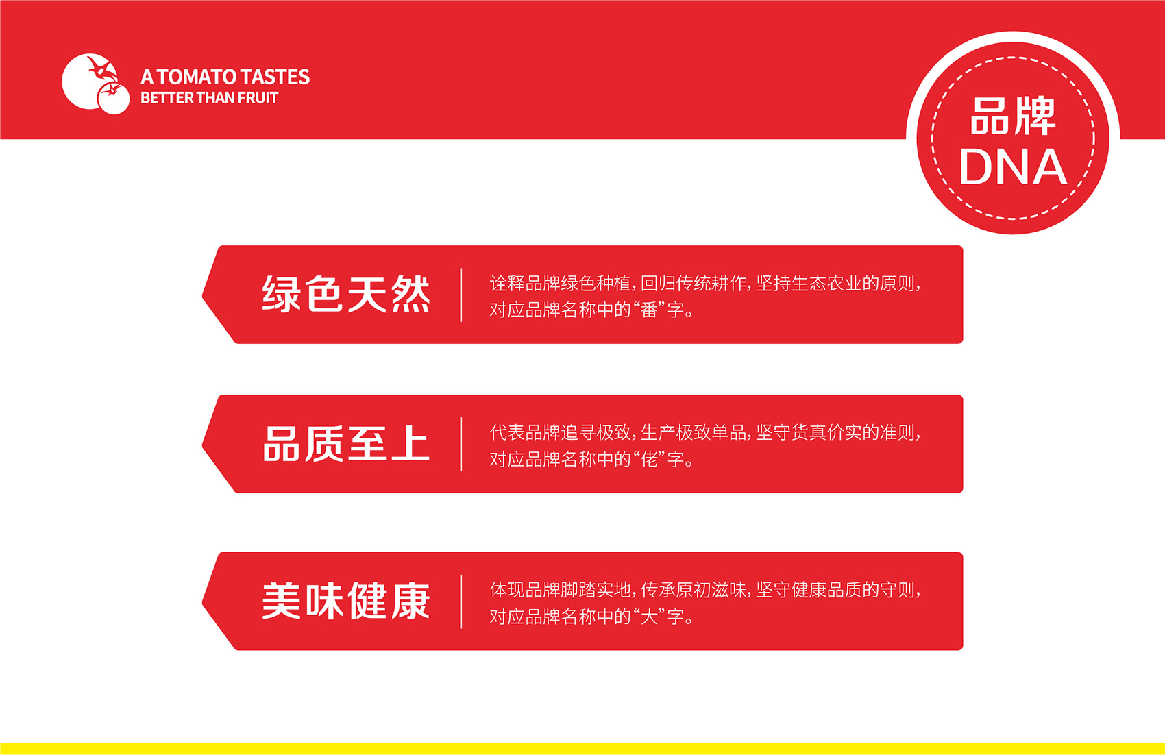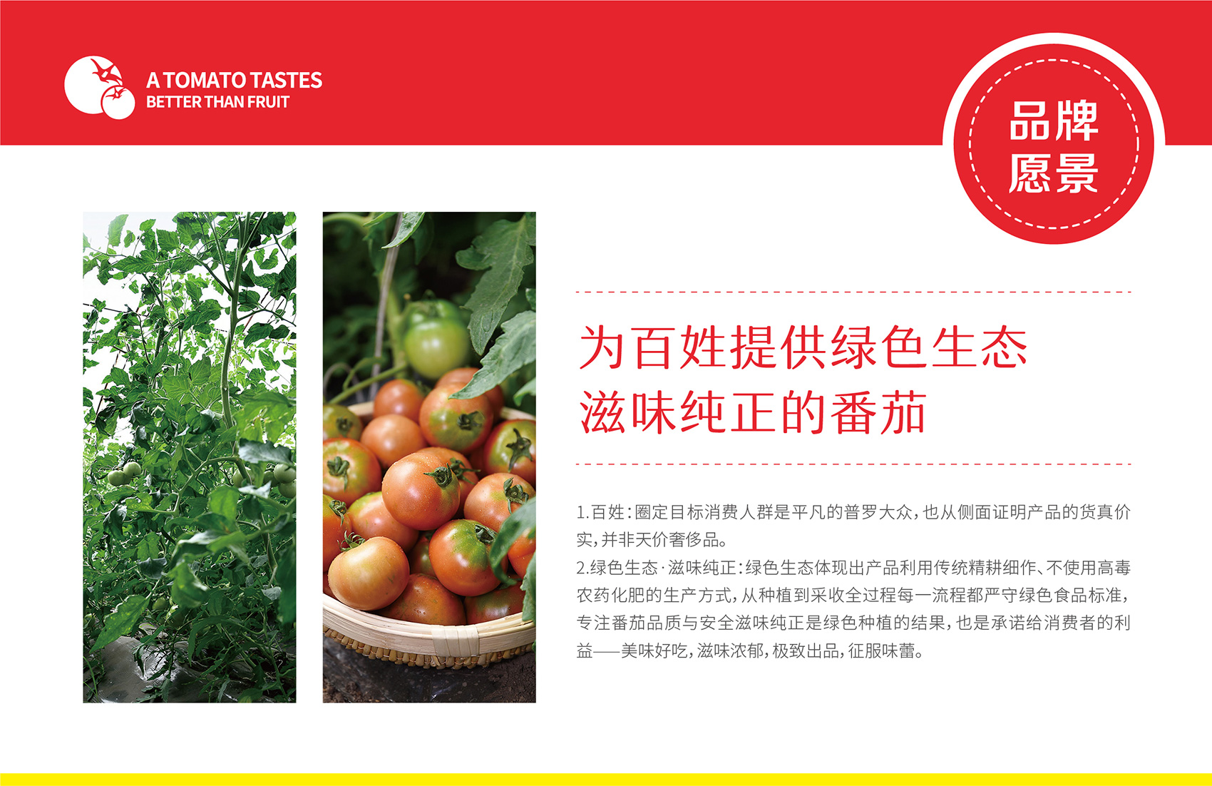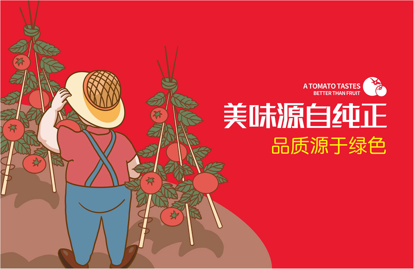 針對(duì)番佬大綠色生態(tài)番茄的定位,繽策提煉出純正為核心概念的文化體系,從品牌DNA開(kāi)始不斷貫穿番佬大番茄的美好滋味,針對(duì)目標(biāo)消費(fèi)人群的審美偏好,以質(zhì)樸平實(shí)的語(yǔ)言風(fēng)格構(gòu)建出綠色生態(tài)番茄的立體體系,slogan為“比水果還好吃的番茄”,不僅針對(duì)消費(fèi)者做出品質(zhì)的承諾與保證,讓消費(fèi)者能清楚明了的了解番佬大值得信賴(lài)的原因,更是對(duì)企業(yè)內(nèi)部的要求,指明了企業(yè)未來(lái)的發(fā)展方向,持續(xù)不斷的為百姓提供綠色健康,安全美味的品質(zhì)番茄。