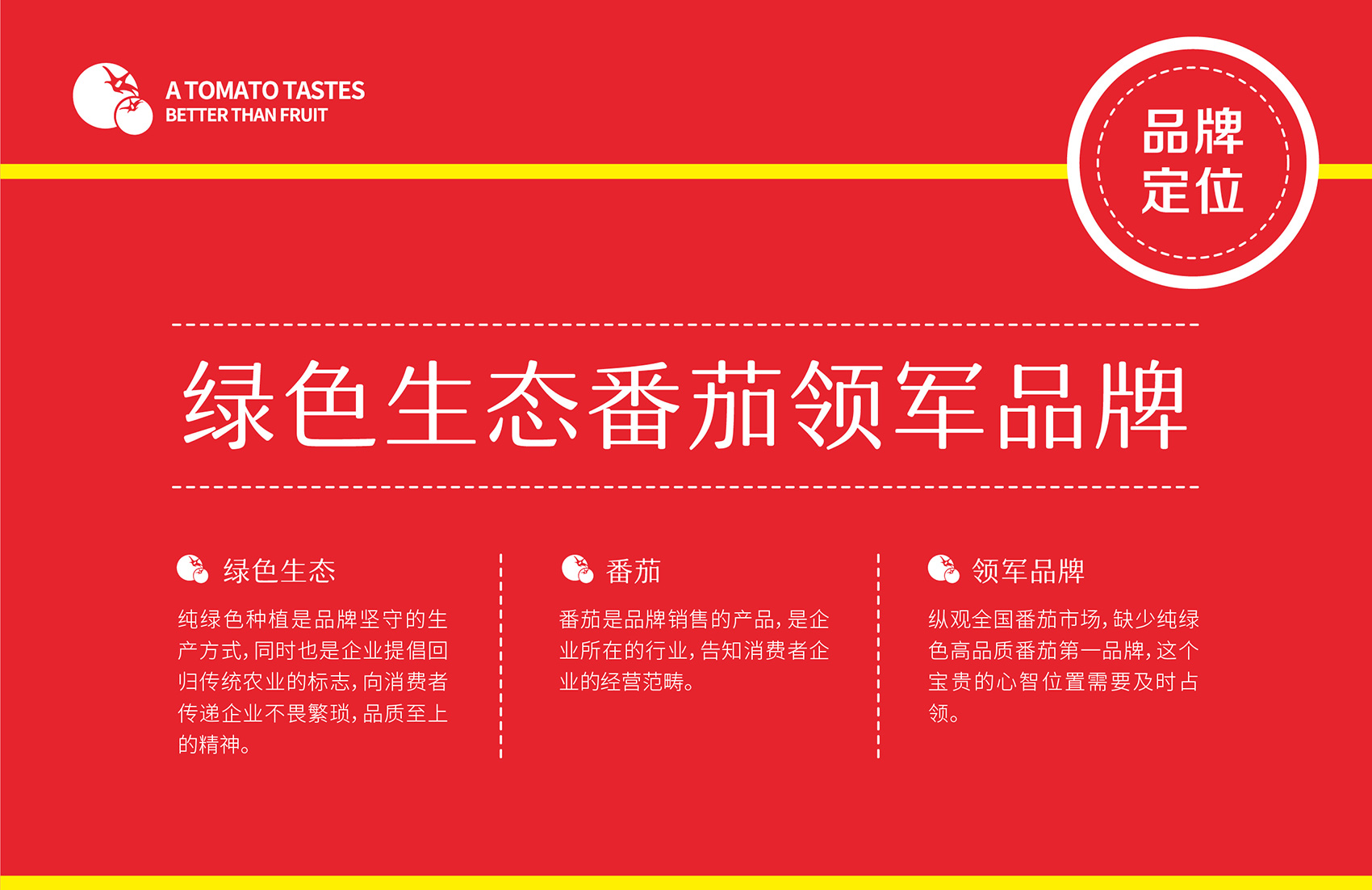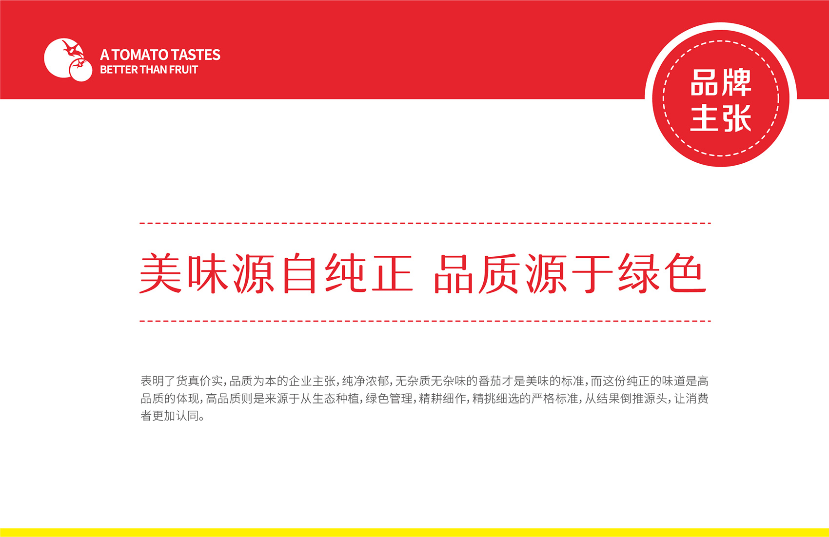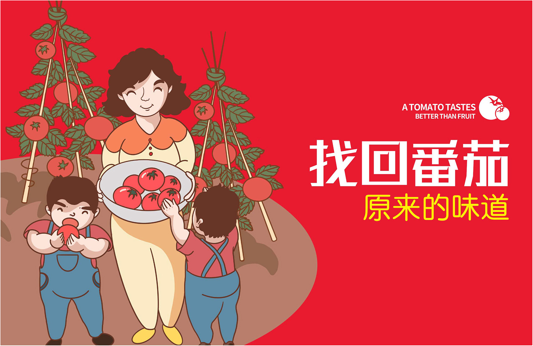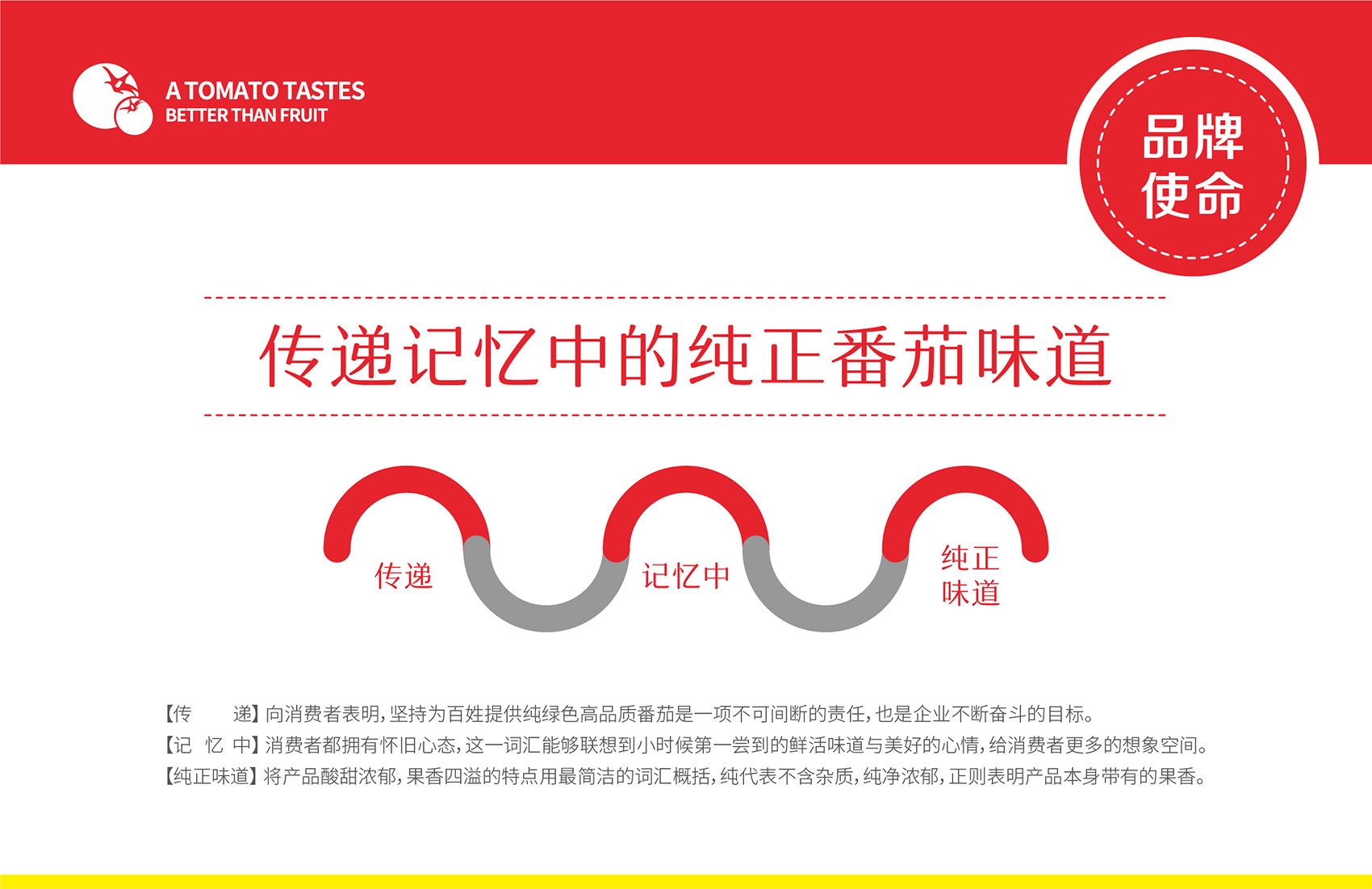 針對(duì)番佬大綠色生態(tài)番茄的定位,繽策提煉出純正為核心概念的文化體系,從品牌DNA開(kāi)始不斷貫穿番佬大番茄的美好滋味,針對(duì)目標(biāo)消費(fèi)人群的審美偏好,以質(zhì)樸平實(shí)的語(yǔ)言風(fēng)格構(gòu)建出綠色生態(tài)番茄的立體體系,slogan為“比水果還好吃的番茄”,不僅針對(duì)消費(fèi)者做出品質(zhì)的承諾與保證,讓消費(fèi)者能清楚明了的了解番佬大值得信賴(lài)的原因,更是對(duì)企業(yè)內(nèi)部的要求,指明了企業(yè)未來(lái)的發(fā)展方向,持續(xù)不斷的為百姓提供綠色健康,安全美味的品質(zhì)番茄。