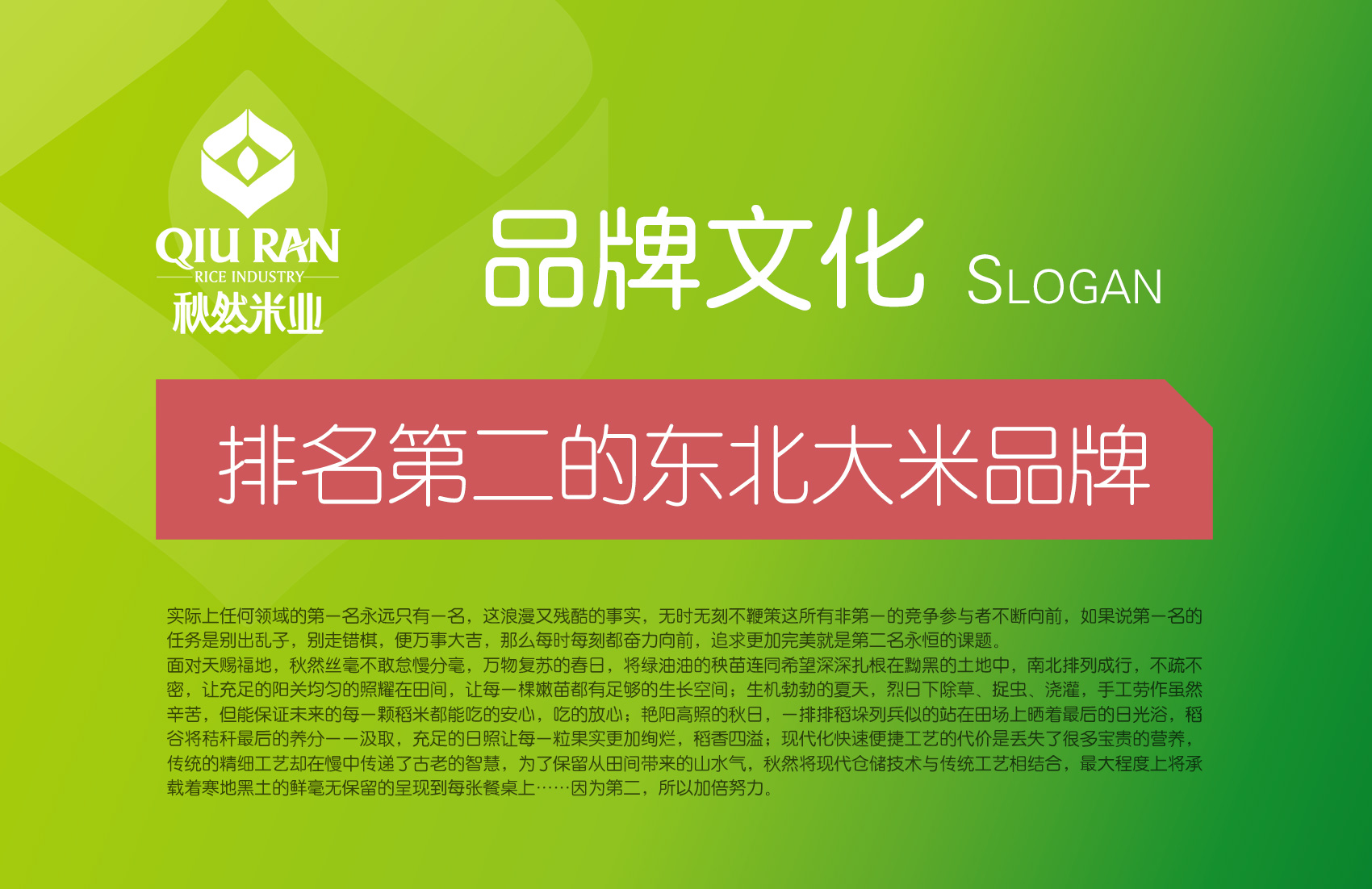 從“更多國人的大米選擇”的品牌定位出發(fā),將30年品牌歷史與備受消費者信賴的東北高品質(zhì)大米的價值滲透下去,將品牌愿景、品牌使命、品牌核心價值、品牌主張、品牌廣告語及品牌故事串聯(lián)起來,并形成一個互相支撐,互相證明的文化話語體系。企業(yè)最高的存在形式就是百年企業(yè),持續(xù)生存源于不斷的滿足社會的需求,而對于秋然來說不斷為消費者奉上品質(zhì)優(yōu)異的好大米就是品牌的終極愿景,所以繽策為秋然構(gòu)建了一個百年計劃,并將品牌愿景歸納為“百年秋然,福澤萬代”;品牌使命的實質(zhì)并非是品牌的責(zé)任,而是企業(yè)的業(yè)務(wù)本身,是企業(yè)每天都在做的事情,也是企業(yè)一直以來為之不斷奮斗的標(biāo)準(zhǔn),繽策為秋然提煉出讓更多人吃上真正的東北好大米的品牌使命;產(chǎn)品品質(zhì)是消費者忠誠的秘訣,而品牌核心價值正是讓消費者變成品牌粉絲的根本原因,此外秋然大米的價格與同品質(zhì)大米相比較為低廉,性價比較高,基于這兩點原因,繽策將秋然的品牌核心價值歸納為“好地種好米,好米吃得起”,用簡潔直白的順口溜告知消費者秋然大米的高品質(zhì)與高性價比;在品牌主張上,繽策選擇將秋然的歷史與銷量通過直觀的數(shù)字直接展現(xiàn)給消費者,用時間證明品牌的價值,同時也代表品牌一直以來堅守品質(zhì)的態(tài)度;在廣告語上,選用“第二主義”來進行宣傳,東北大米市場群龍無首的局面中沒有真正意義上的排名第一,而第二就代表了實際上的第一,同時第二名會盯住第一名而不斷努力前進,如果說第一的任務(wù)不出亂子,謹(jǐn)慎小心,而第二名則是拼盡全力,加倍努力,永遠(yuǎn)追求更好。此外數(shù)字更容易引起消費者的注意力,同時會勾起消費者的好奇心,會驅(qū)使消費者更加關(guān)注品牌,更愿意了解品牌,極大的降低了傳播與記憶成本;在品牌故事方面,使用散文詩般的風(fēng)格構(gòu)建出一幅充滿收獲與喜悅的圖景,通過畫面感讓消費者直觀的了解秋然兩字所承載的含義,也簡述了品牌對于未來與堅守的故事。