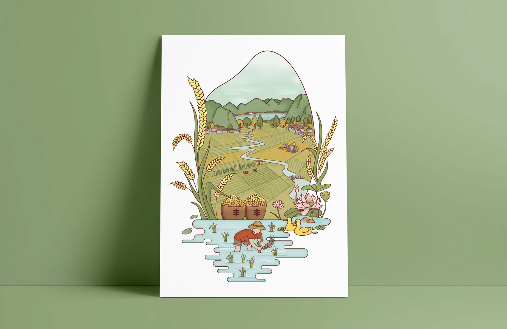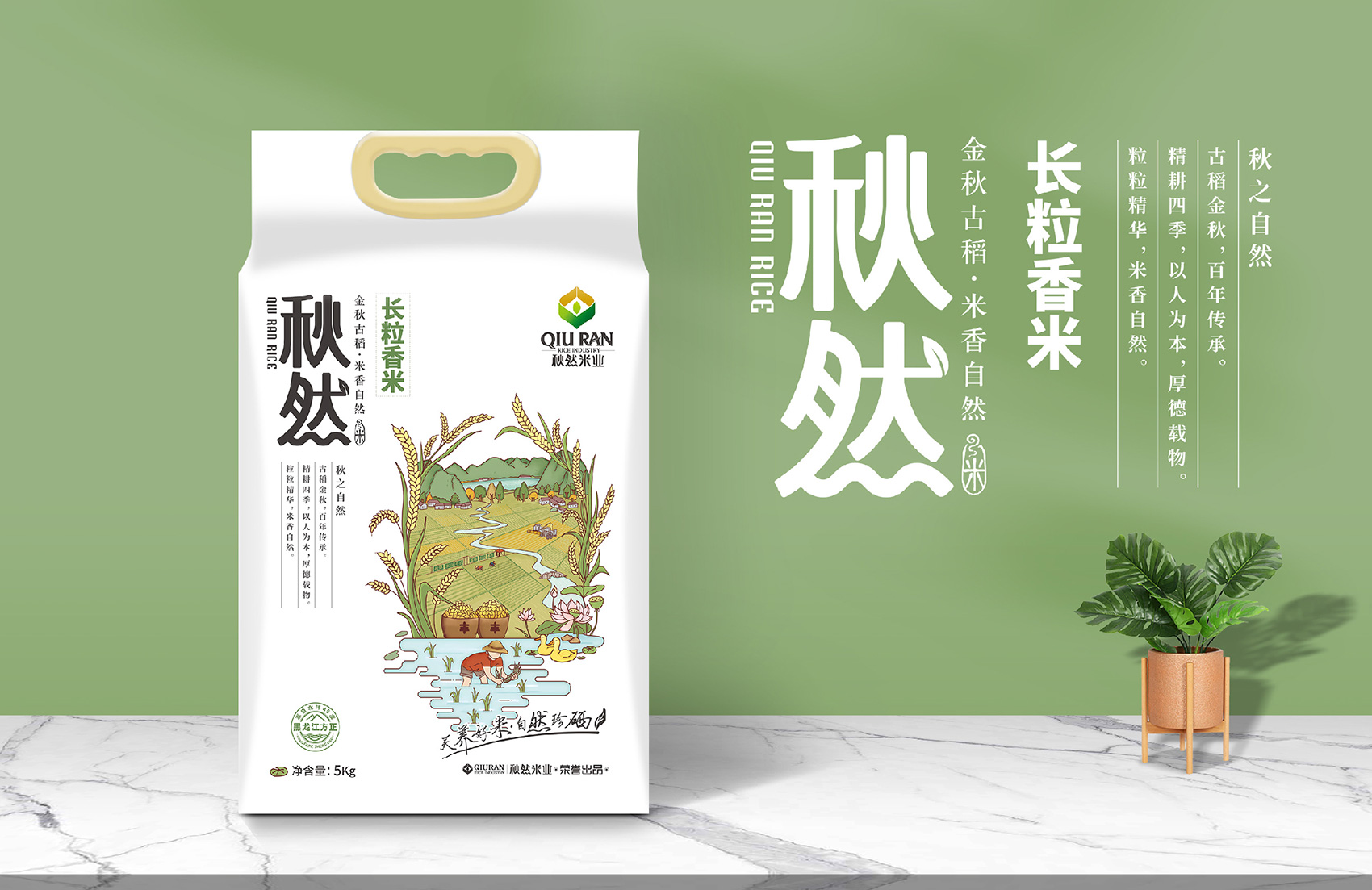 秋然系列大米則選擇以種植場景與方正的自然風(fēng)光為主體,構(gòu)建出純凈天然的自然下手工種植的美妙場景,清荷飄香,鴨群閑適的漂在水面上,生機盎然,和諧寧靜,翠綠色的田野上農(nóng)人在除草捉蟲,收割機在辛勤的工作,整個畫面滿溢著秋收的喜悅。本款超級符號的主體是一個正在插秧的農(nóng)人,向消費者傳遞這品牌的核心價值——好地種好米,好米吃得起。清新淡雅的插畫生動形象的展現(xiàn)了方正的優(yōu)質(zhì)自然條件與秋然大米的卓越品質(zhì),同時喚起消費者記憶中有關(guān)田園牧歌的文化符號,借用千百年來中華農(nóng)耕文明的原力,激發(fā)消費者對品牌的親切與熟悉感,整體畫面元素豐富,構(gòu)圖飽滿,配色和諧有序。