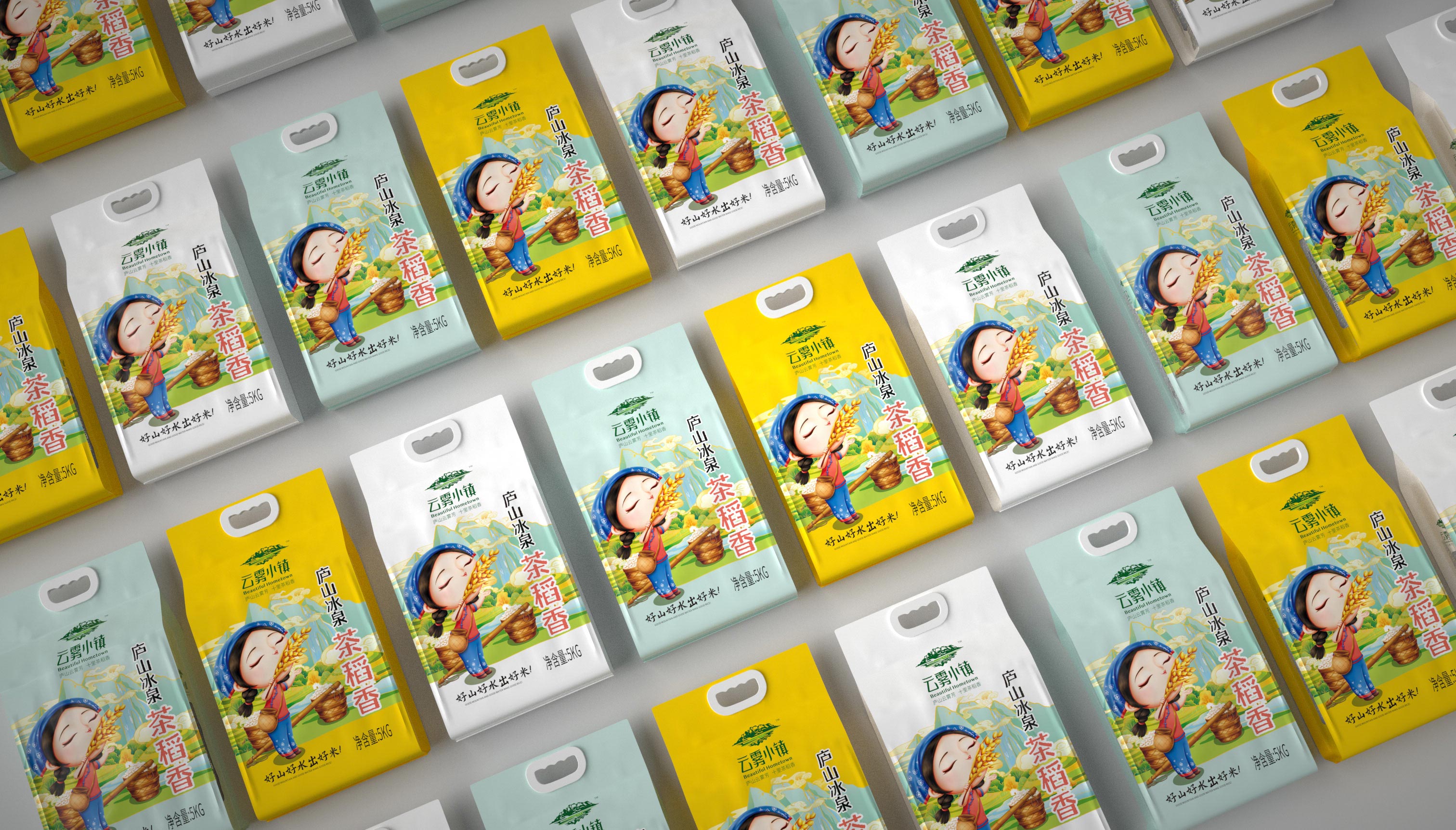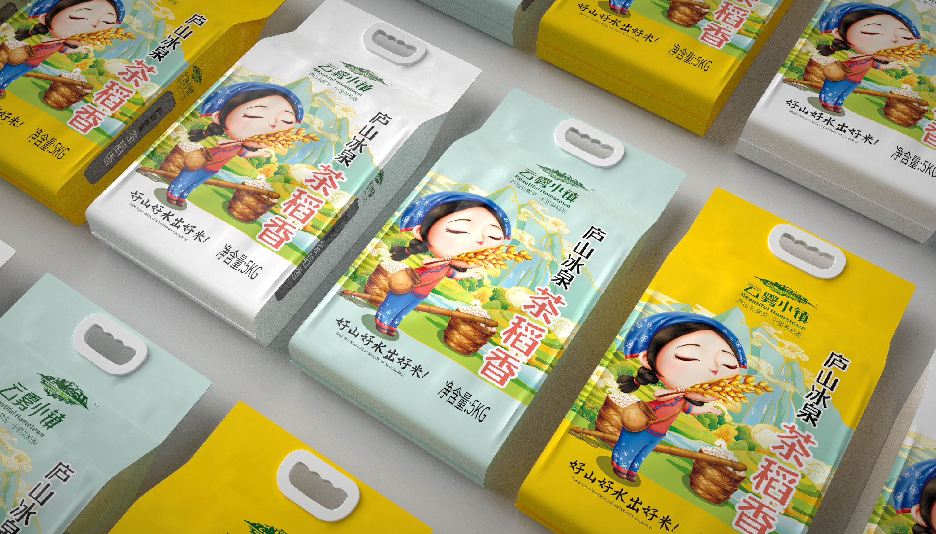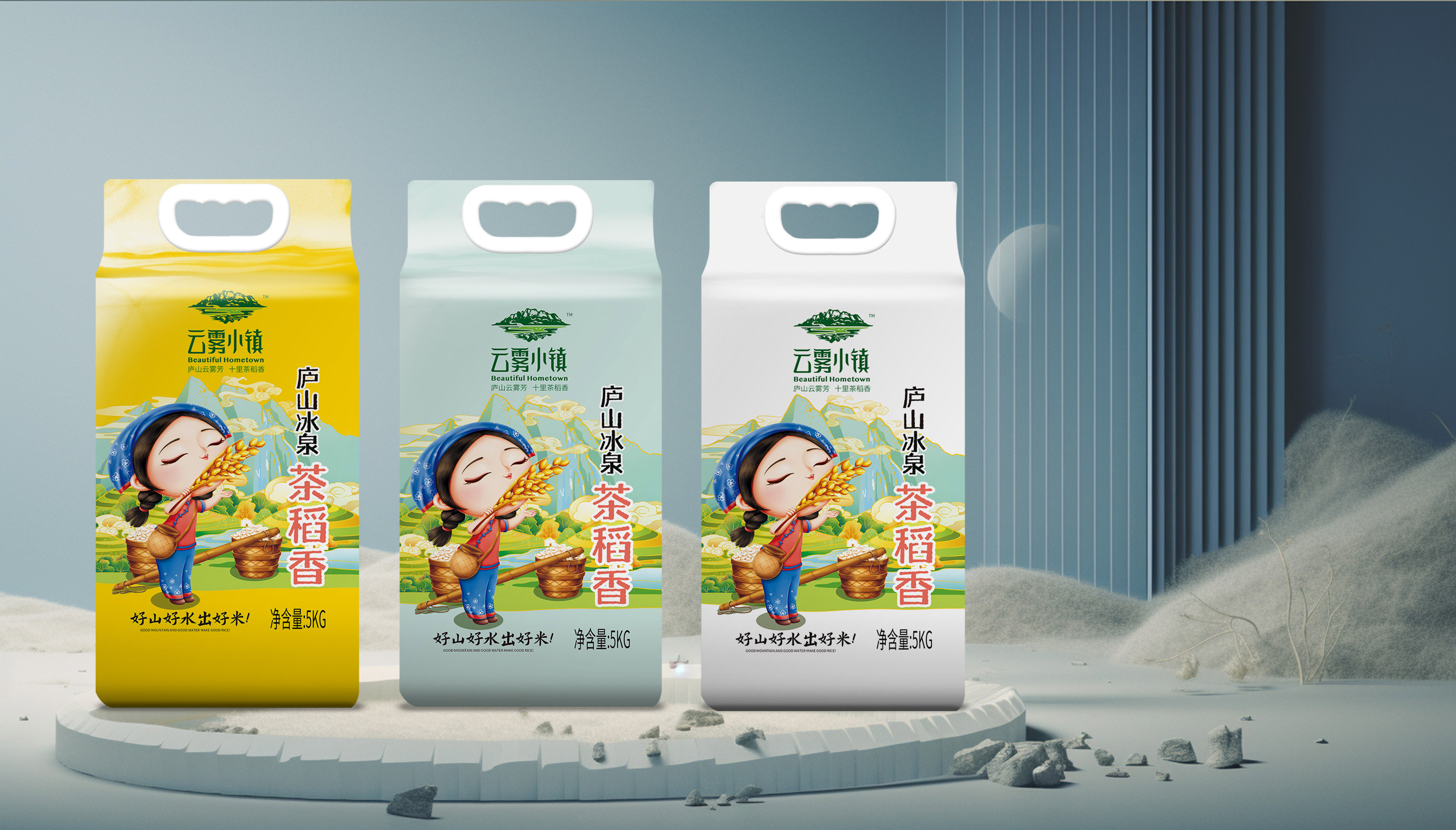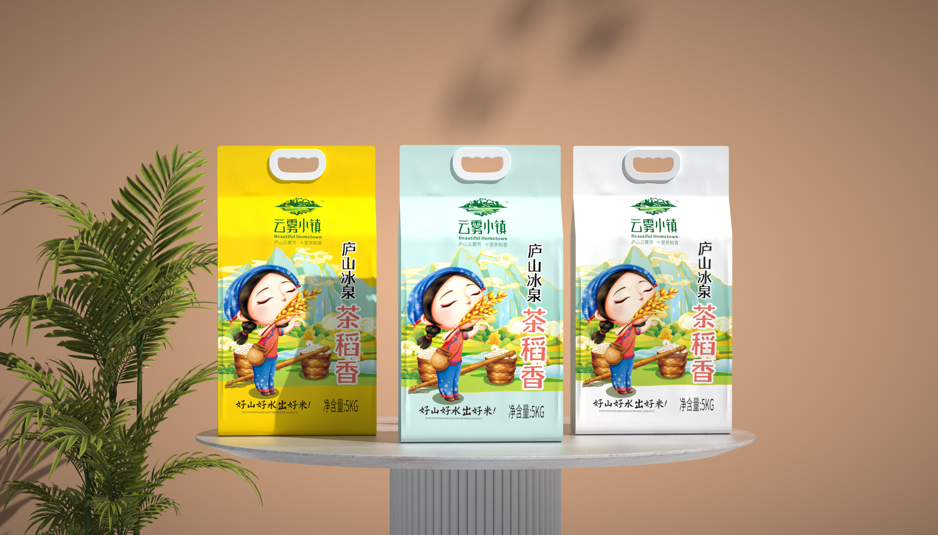 作為地域性品牌,云霧小鎮(zhèn)歸屬于較為具象的名詞,同時也是產(chǎn)品的自然生長環(huán)境,在傳播與認(rèn)知層面上越具體的元素越能讓消費者記住,以產(chǎn)品產(chǎn)地廬山五老峰為主體,展現(xiàn)出稻場云海霧罩、青山秀水的得天獨厚的自然環(huán)境,凸顯地域特色,進(jìn)而將品牌與自然品質(zhì)相掛鉤;同時此處大米與其他競品最大的區(qū)別,就是產(chǎn)地周圍茶園眾多,可以說稻米是在茶香的熏陶下長大的,所以提煉出“茶稻”的概念,將純凈自然、高品質(zhì)等品牌印象蘊(yùn)含其中,創(chuàng)作出“廬山云霧芳,十里茶稻香”的slogan,并以此為核心延展包裝及IP,幫助品牌系統(tǒng)化的搭建基礎(chǔ)框架。