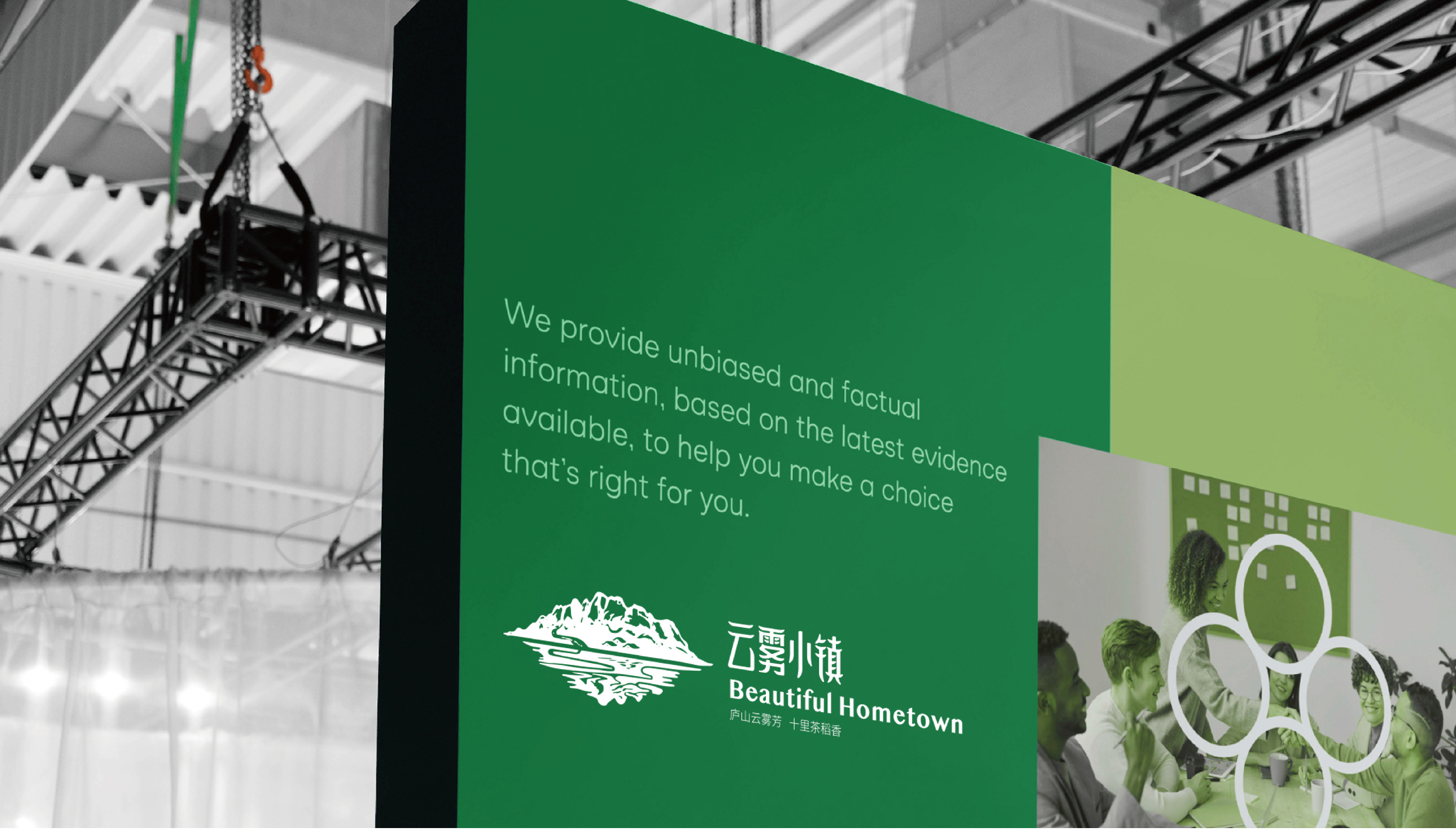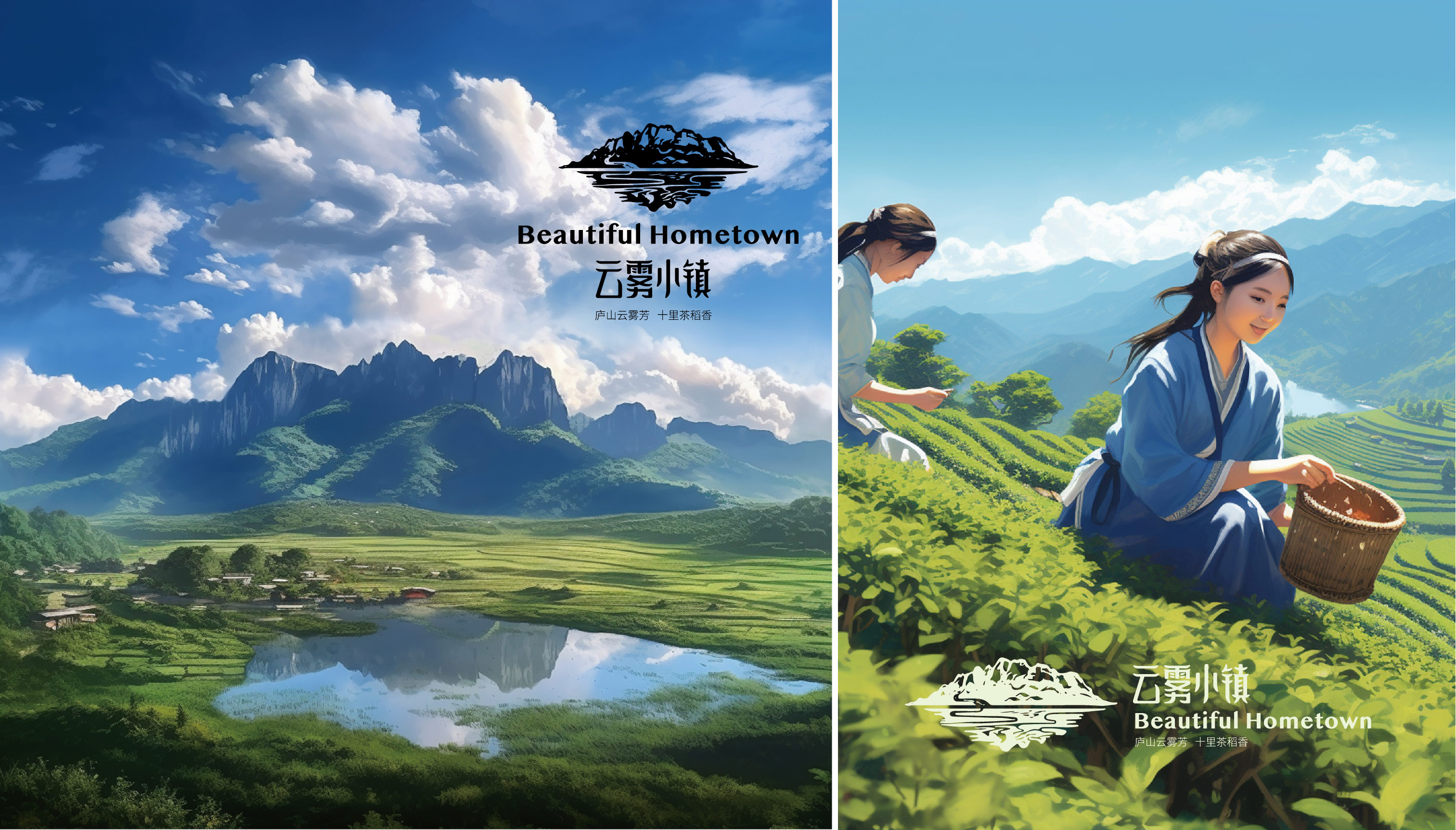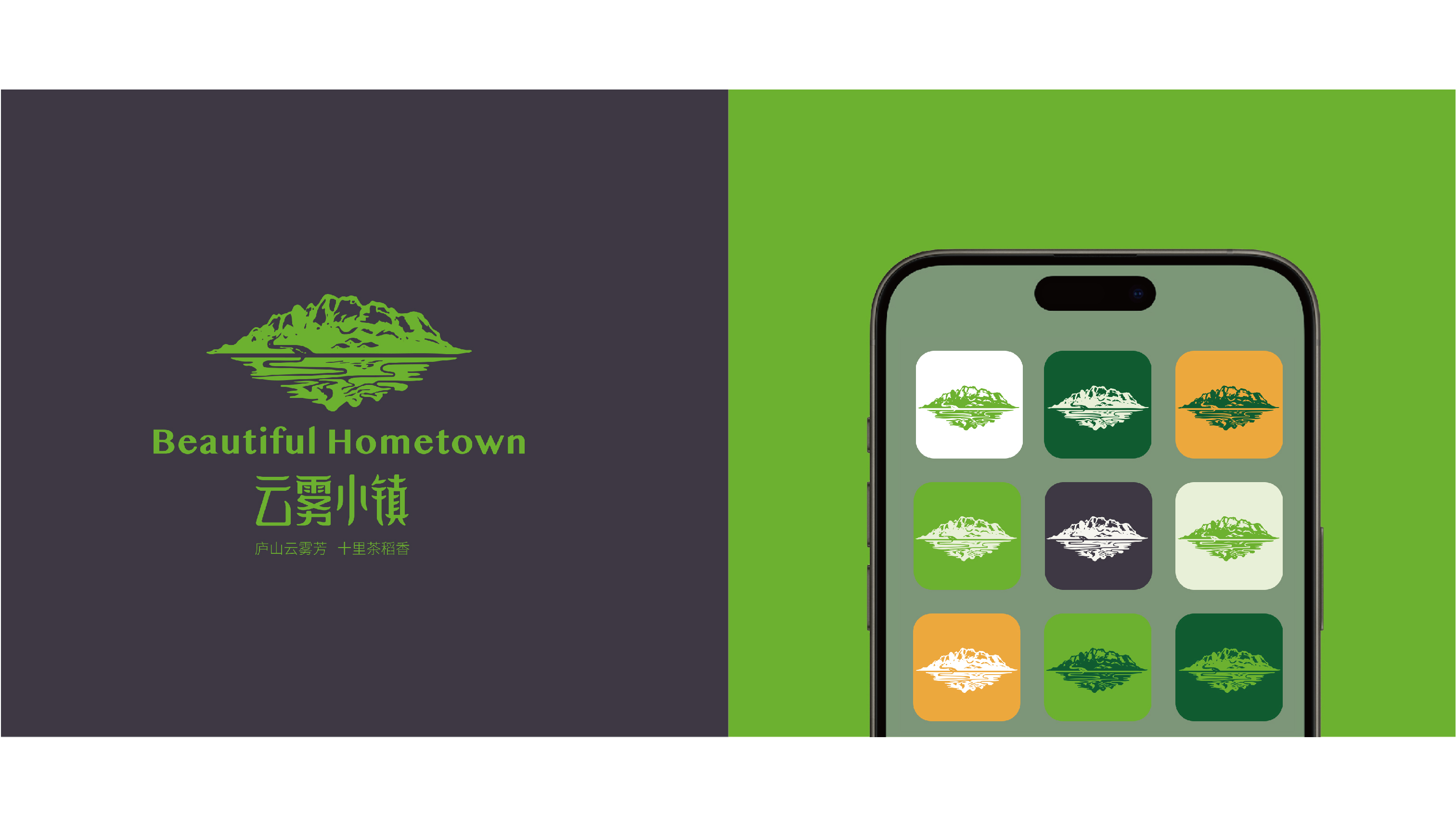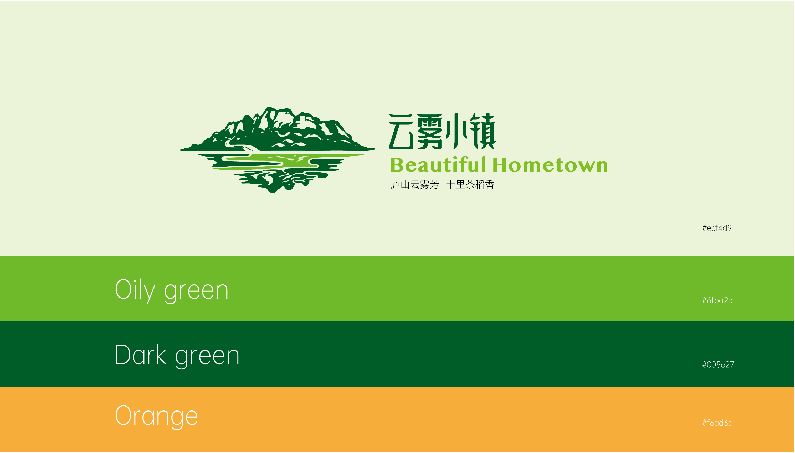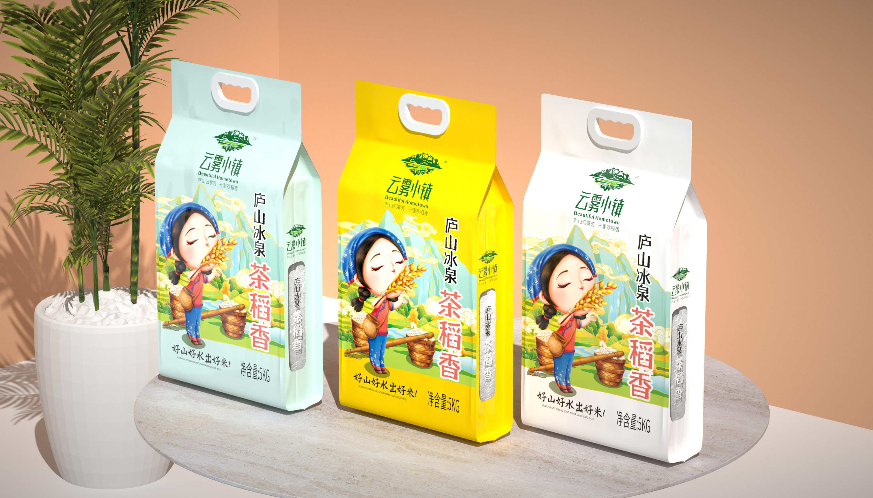 作為地域性品牌,云霧小鎮(zhèn)歸屬于較為具象的名詞,同時也是產(chǎn)品的自然生長環(huán)境,在傳播與認(rèn)知層面上越具體的元素越能讓消費者記住,以產(chǎn)品產(chǎn)地廬山五老峰為主體,展現(xiàn)出稻場云海霧罩、青山秀水的得天獨厚的自然環(huán)境,凸顯地域特色,進(jìn)而將品牌與自然品質(zhì)相掛鉤;同時此處大米與其他競品最大的區(qū)別,就是產(chǎn)地周圍茶園眾多,可以說稻米是在茶香的熏陶下長大的,所以提煉出“茶稻”的概念,將純凈自然、高品質(zhì)等品牌印象蘊(yùn)含其中,創(chuàng)作出“廬山云霧芳,十里茶稻香”的slogan,并以此為核心延展包裝及IP,幫助品牌系統(tǒng)化的搭建基礎(chǔ)框架。