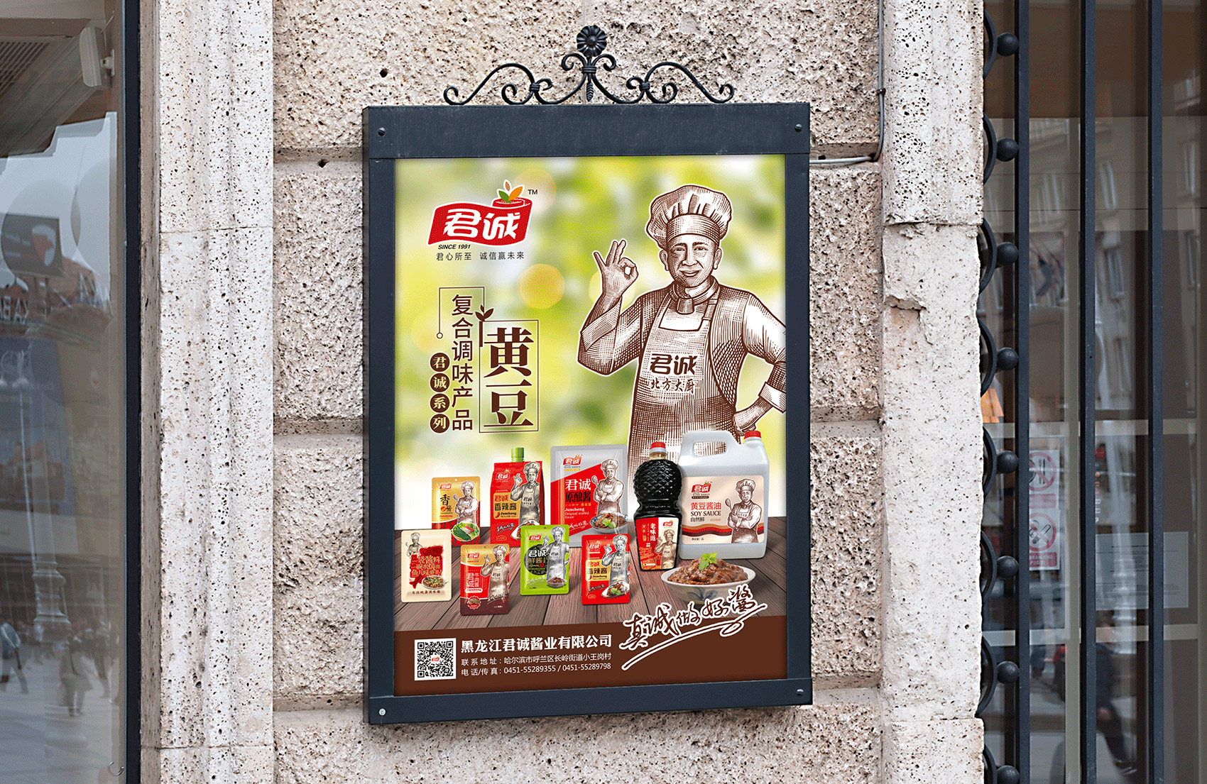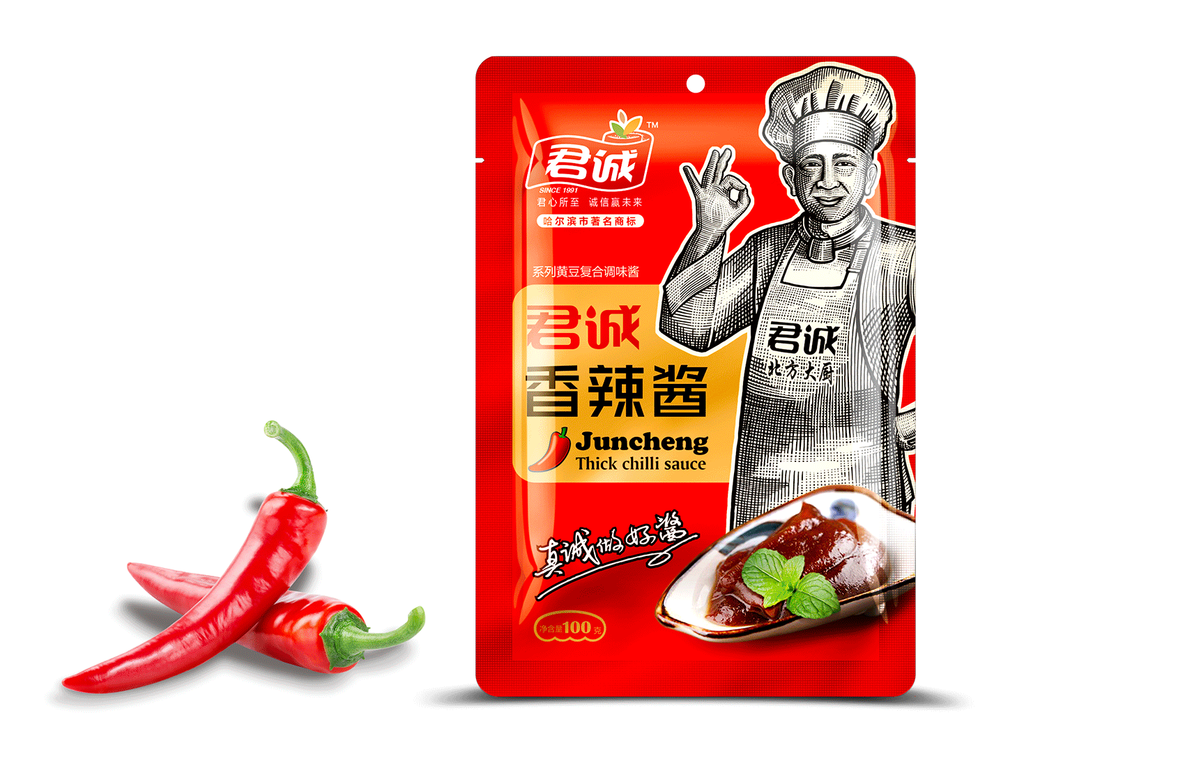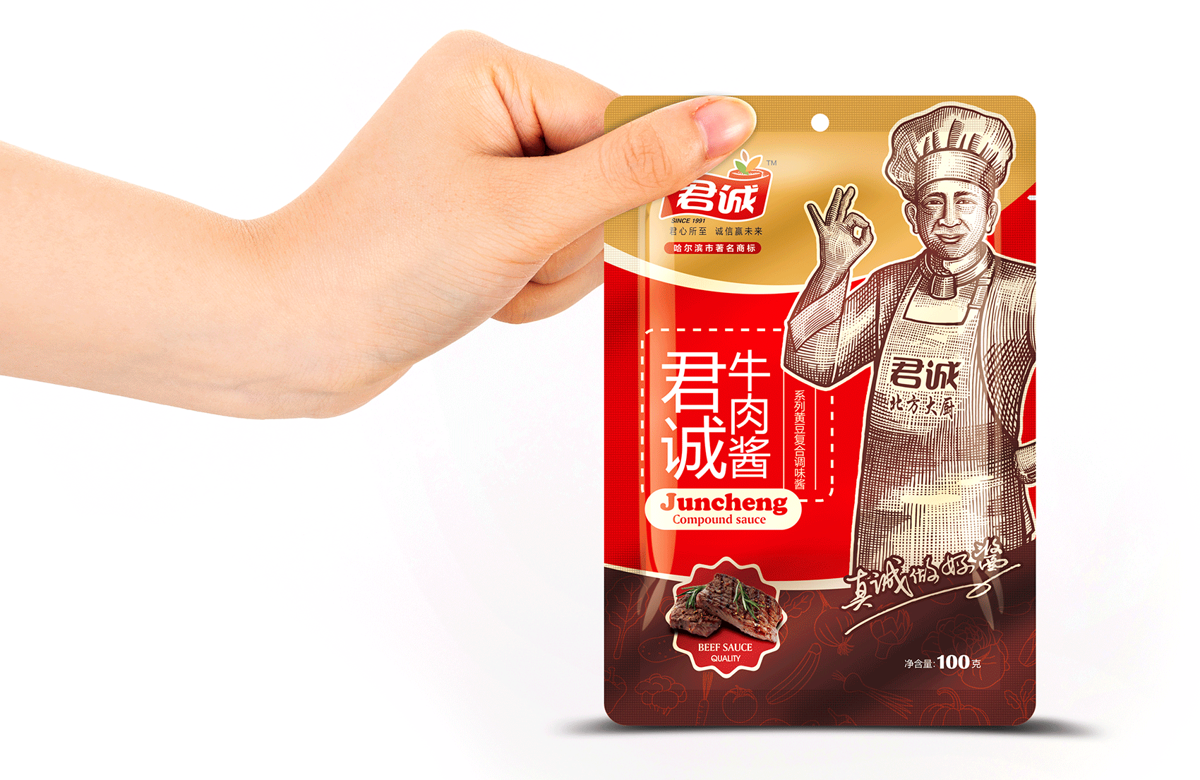 君誠(chéng)醬以原釀醬為出發(fā)點(diǎn),潛心研制釀造工藝,味道更鮮香,滋味更醇厚,適合北方人口味的醬料系列,品質(zhì)的保證是品牌能夠植入心智的第一步,這同時(shí)也是君誠(chéng)醬與其他醬料最大的差異化賣(mài)點(diǎn)——真心實(shí)意,真材實(shí)料,于是產(chǎn)品的廣告語(yǔ)自然而然脫口而出——真誠(chéng)做好醬;接下來(lái)就是如何通過(guò)視覺(jué)化符號(hào)最大程度最有效率的將君誠(chéng)醬的優(yōu)勢(shì)傳遞給消費(fèi)者,繽策經(jīng)過(guò)頭腦風(fēng)暴后想到了深入人心的超級(jí)符號(hào)——北方大廚。