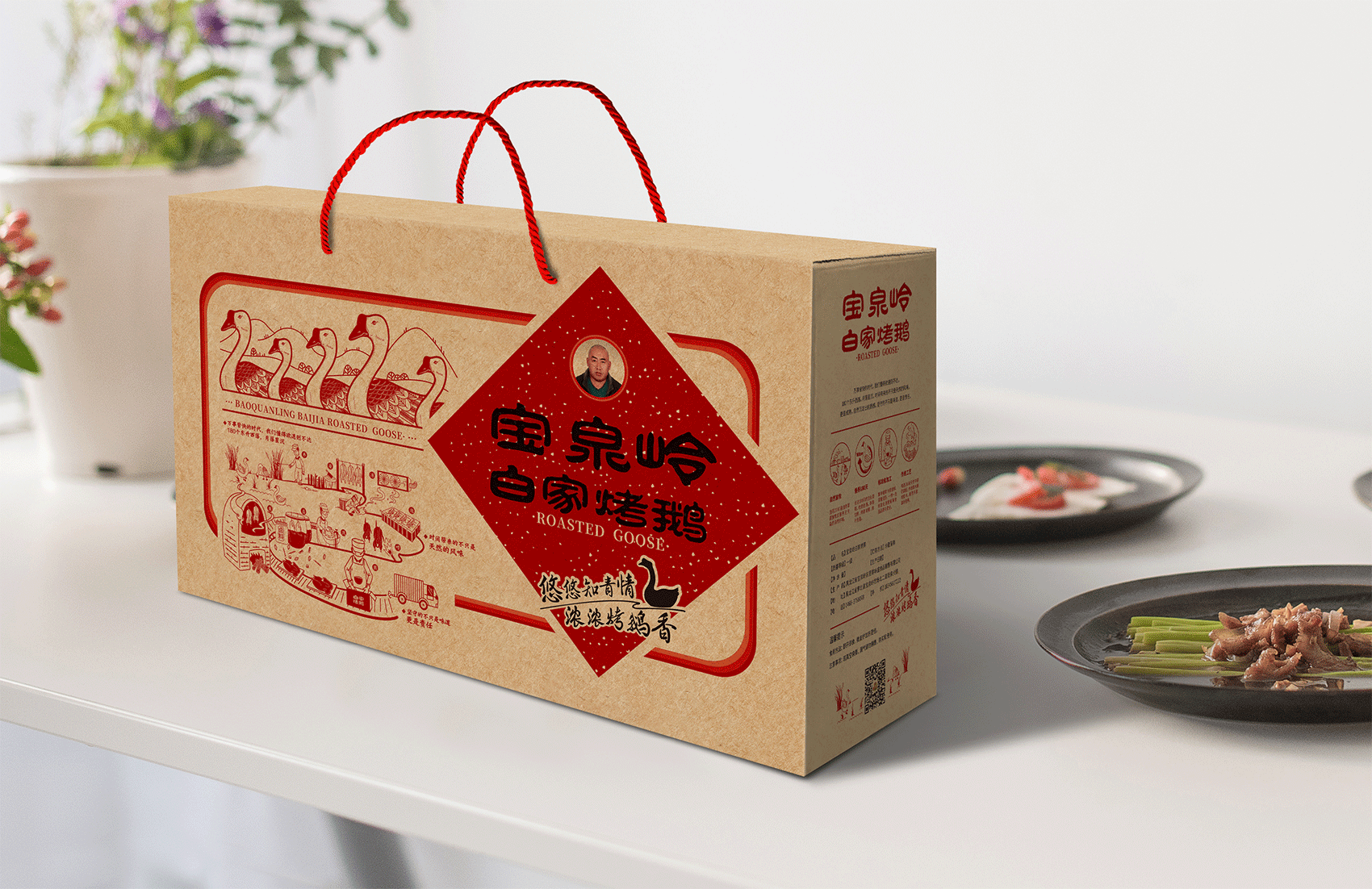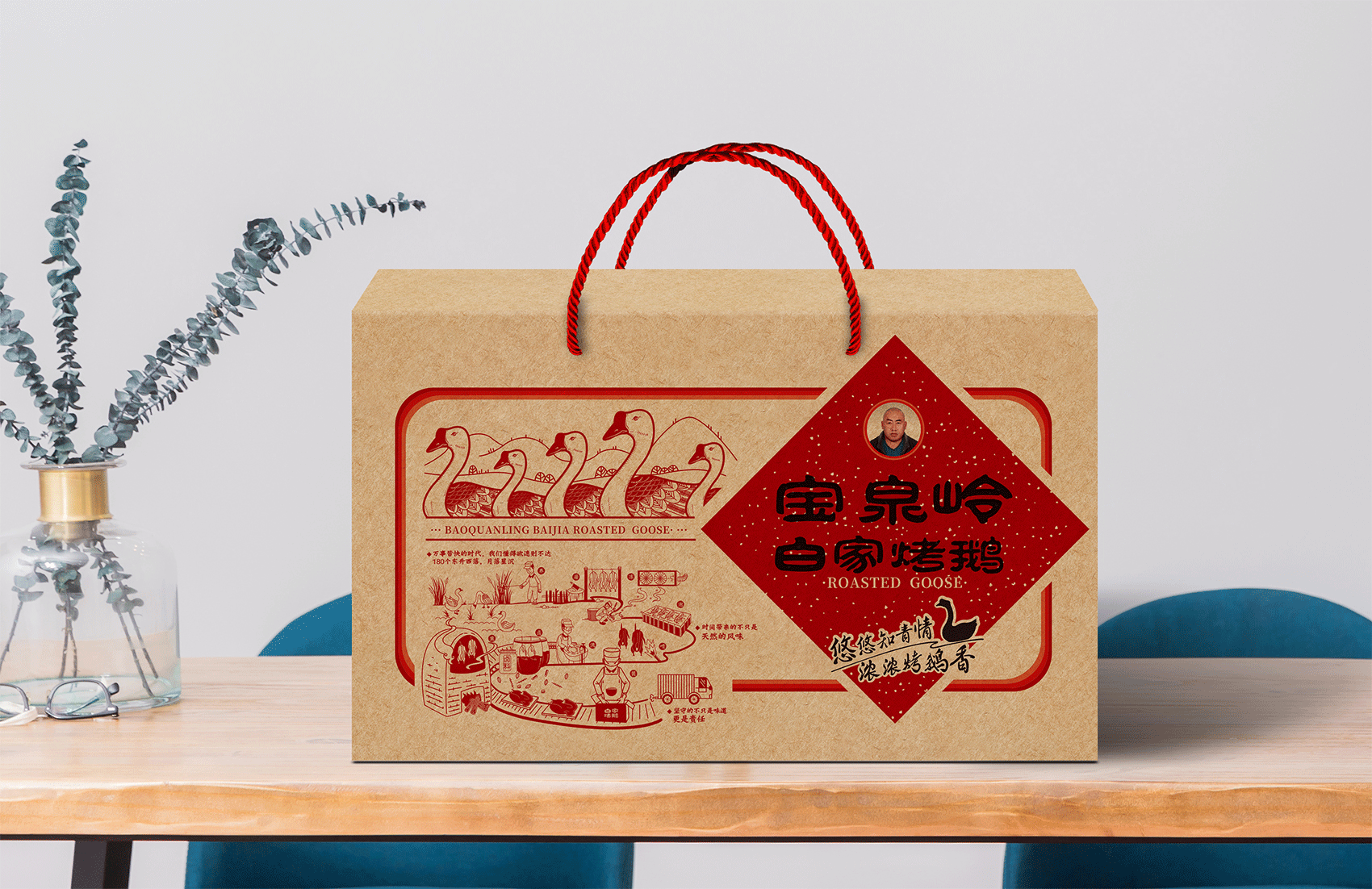 以真實形象示人代表敢為產(chǎn)品與品牌負責,白家烤鵝的LOGO選擇以創(chuàng)始人的照片進行注冊本身就代表了一種承諾,結合知青群體的審美,繽策將“寶泉嶺白家烤鵝”與標志組合成一個喜慶的中式春聯(lián)的吉祥圖案,通過中式春聯(lián)的傳統(tǒng)符號將寶泉嶺白家烤鵝植入到消費者心智,形成喜慶紅火,佳節(jié)伴手禮的品牌印象;字體使用原創(chuàng)設計字體,參考傳統(tǒng)隸書的書法風格,方勁古拙,厚重可靠,其中的“嶺”字右半部分經(jīng)過整合,形似“合”字代表了品牌對于消費者的美好祝愿與對于烤鵝事業(yè)的不懈努力的目標愿景。